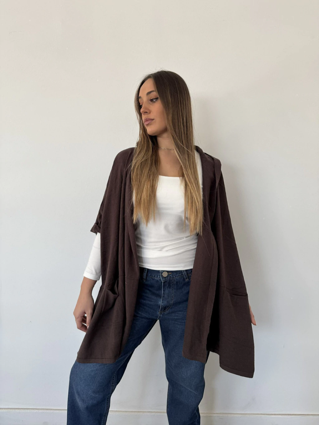 Disponible en cinco colores elegantes: negro, crudo, bordeaux, gris y marrón, que combinan fácilmente con cualquier outfit. Una pieza versátil y distinguida para tu guardarropa.