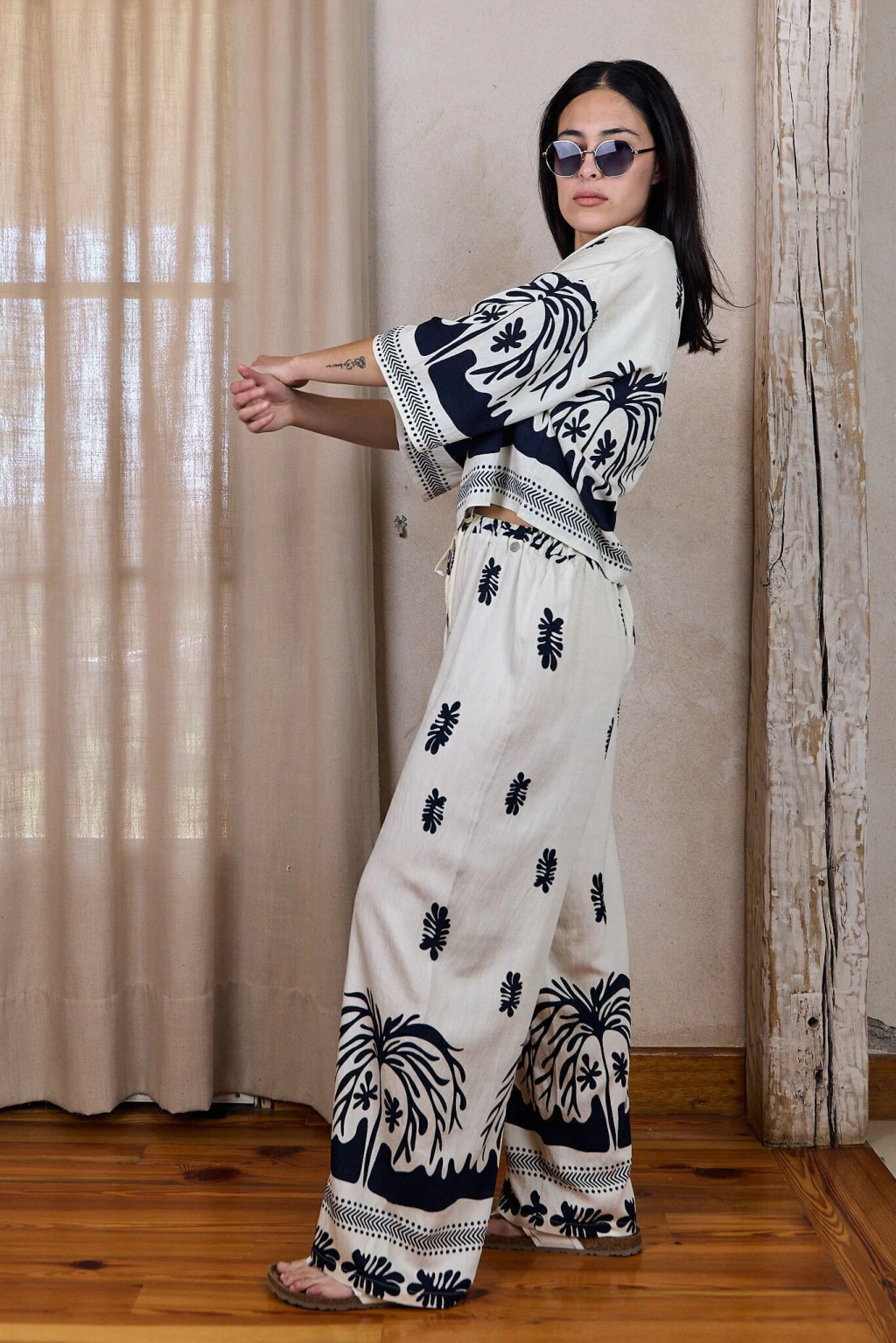 Descubrí el pantalón palazo con cintura elástica y cordón ajustable, confeccionado en tela de alta calidad que garantiza una caída perfecta. Su corte fluido realza la silueta, aportando una presencia elegante y sofisticada. El detalle distintivo de estampado con guarda en la botamanga, sobre fondo offwhite y estampa azul noche, añade un toque único y refinado. Ideal para combinar en ocasiones formales o casuales, este pantalón es una pieza imprescindible en tu guardarropa.