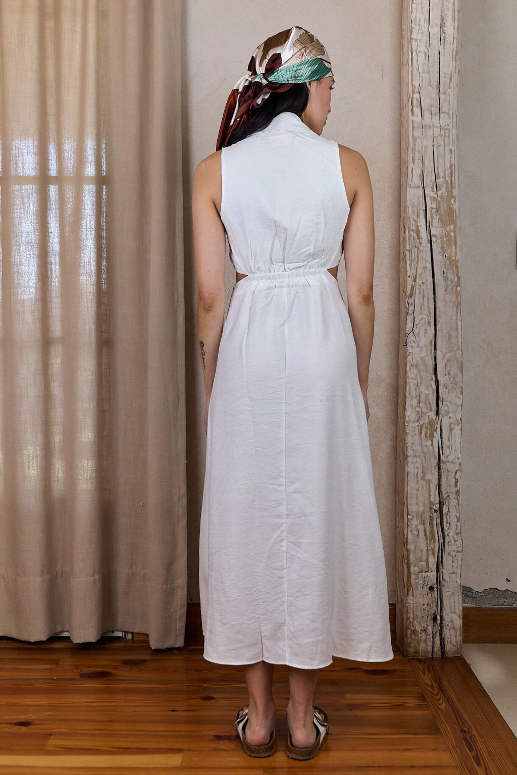 Descubrí este vestido que combina elegancia y feminidad con una falda acampanada que realza la figura. Presenta un detalle en el escote delantero con frunces y un cuello tipo camisa que aporta sofisticación. Los recortes laterales a la altura de la cintura estilizan la silueta, mientras que el escote en forma de V y el elástico debajo del busto y en la espalda aseguran un ajuste cómodo y adaptable. Una prenda ideal para quienes valoran el diseño y la distinción.